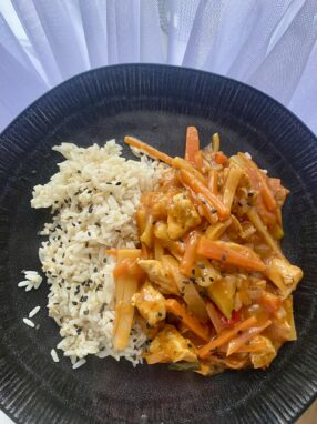 Podajemy z ugotowanym ryżem oraz mango.🥭