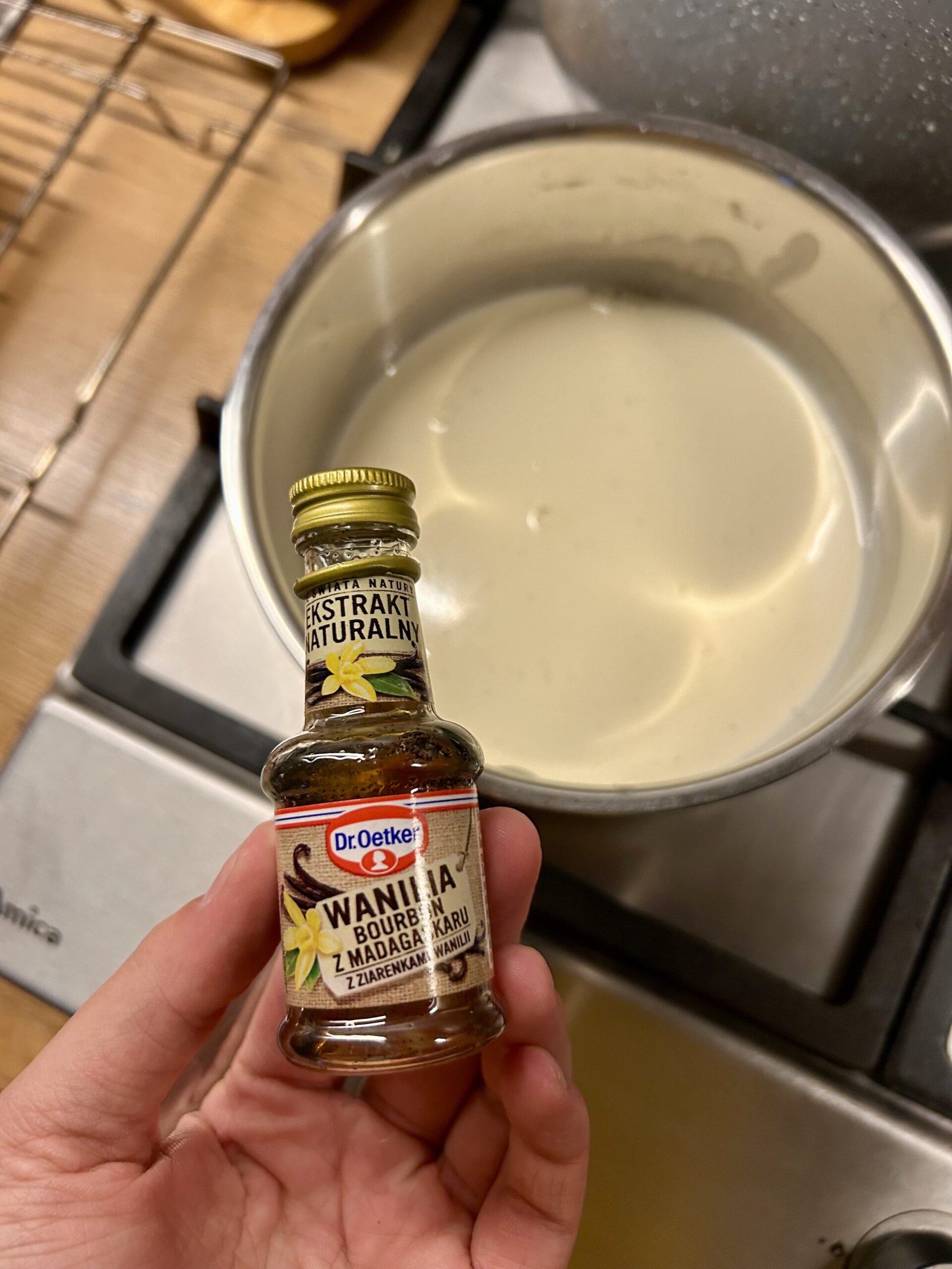 Śmietankę łączę z ekstraktem waniliowym i lekko podgrzewam na małym ogniu.