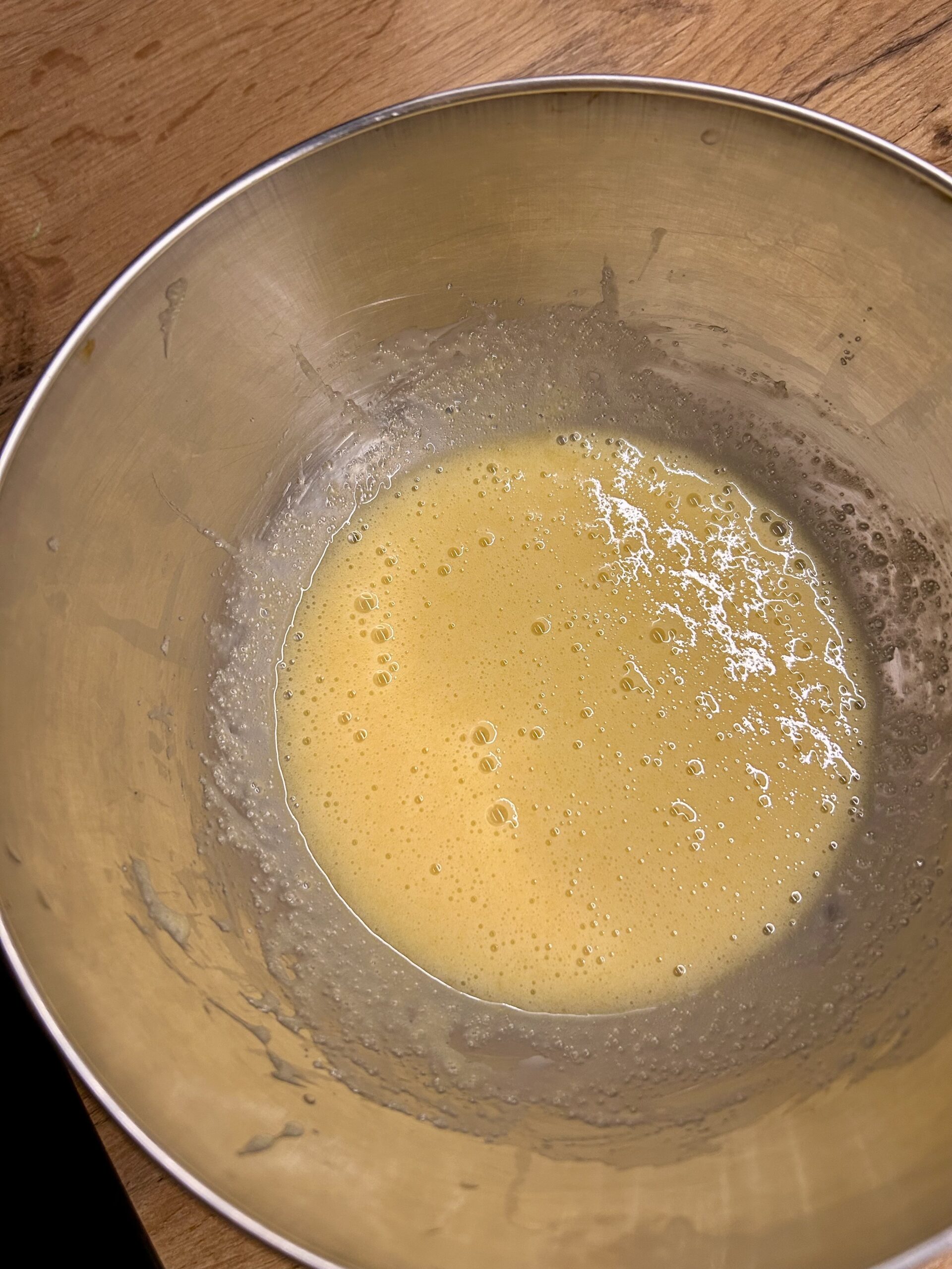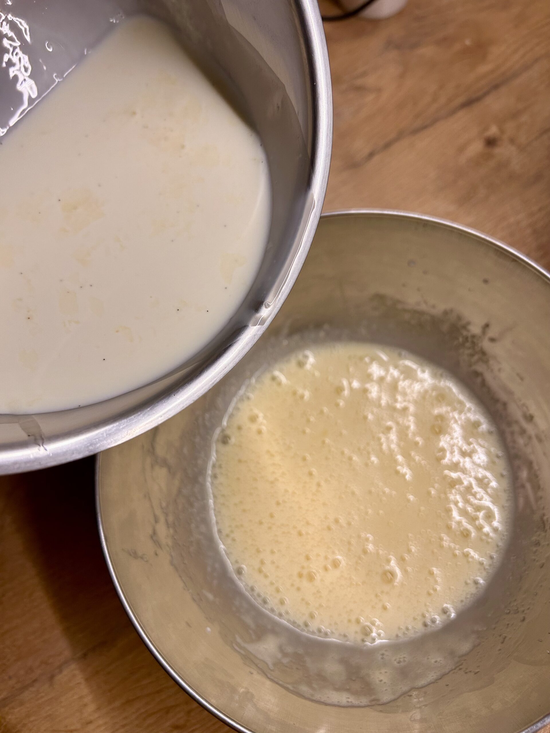 Powoli wlewam ciepłą! śmietankę do żółtek, cały czas mieszając. W razie potrzeby masę można przecedzić przez sitko.