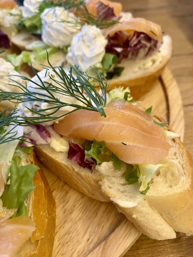 Na bagietkę wykładamy liść sałaty, plasterek łososia oraz wyciśnięty przez rękaw cukierniczy serek. Kanapeczki dekorujemy koperkiem i plasterkiem cytryny.