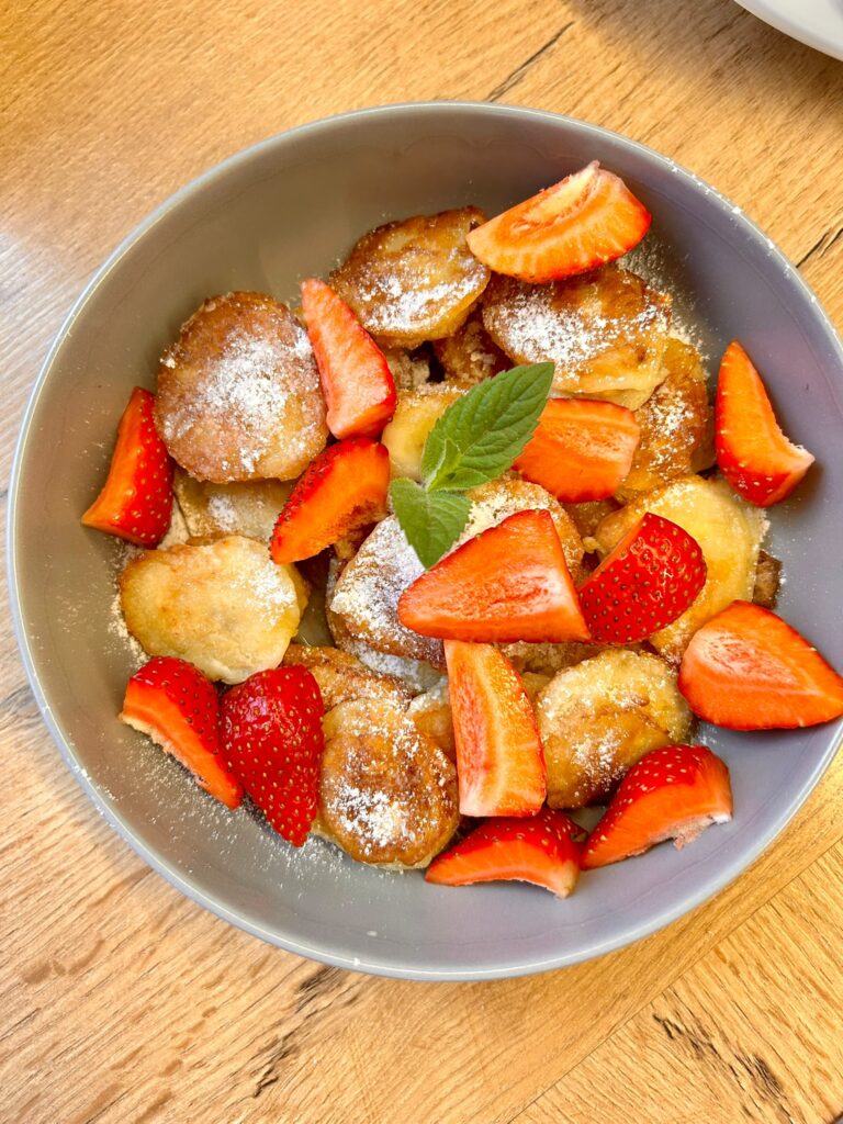 Mini pancakes bananowe to małe, puszyste placuszki przygotowane z dojrzałych bananów, które nadają im naturalną słodycz i aromat — idealne na szybkie, zdrowe śniadanie lub słodką przekąskę.