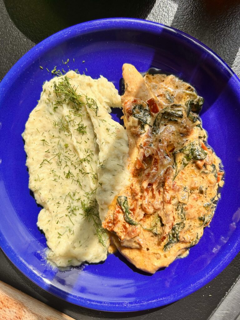 Pierś z kurczaka w sosie z suszonymi pomidorami podana z puree to soczyste mięso w aksamitnym, aromatycznym sosie podana z delikatnym puree ziemniaczanym.