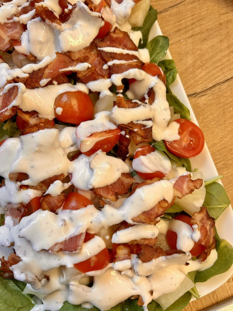 Na talerz wykładamy liście szpinaku, ananasa, pokrojone na pół pomidorki koktajlowe, chipsy z boczku oraz całość polewamy sosem.