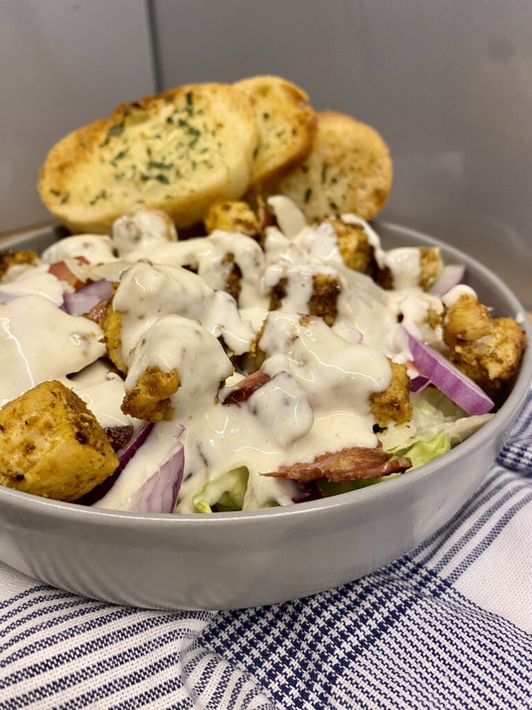 Na talerz wykładamy sałatę lodową, pomidorki, cebulę czerwoną, kurczaka, boczek, płatki pecorino romano. Całość polewamy sosem i podajemy z grzankami.