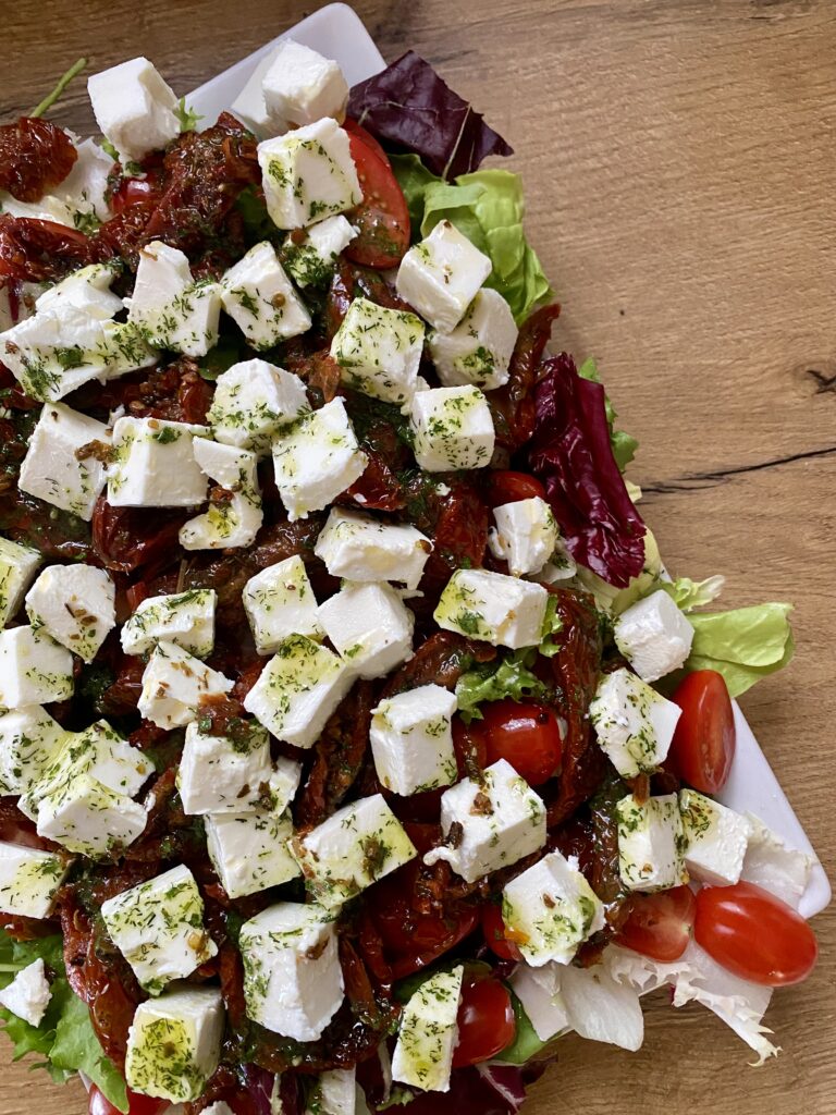 Na talerz wykładamy mix sałat, przekrojone na pół pomidorki koktajlowe, pomidory suszone i pokrojony w kostkę ser kanapkowy typu feta. Całość polewamy sosem.