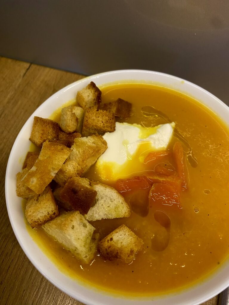 Krem z dyni to aksamitna, aromatyczna zupa o słodkawym smaku pieczonej dyni i nutą korzennych przypraw. Rozgrzewająca i delikatna — idealna na jesienne dni.